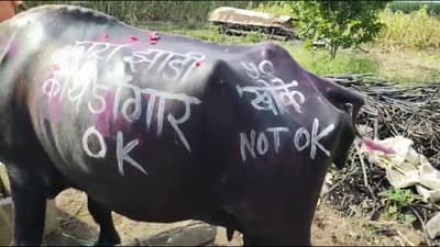 बैल पोळ्याच्या दिवशी म्हशीच्या पाठीवर शेतकर्यानी डायलॉग लिहले असुन 50 खोके नॉट ओके असं देखील लिहण्यात आलंय.