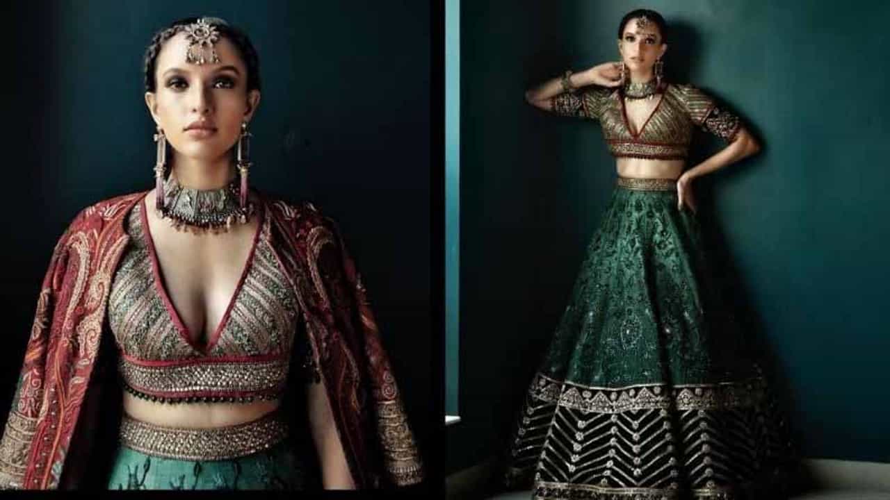 पूर्ण नक्षीदार ग्रीन लेहेंगा, भरतकाम केलेला ब्लाऊज आणि भरतकाम केलेला दुपट्टा या ‘नववधू’ लूकमध्ये तृप्ती खूपच सुंदर दिसत आहे.