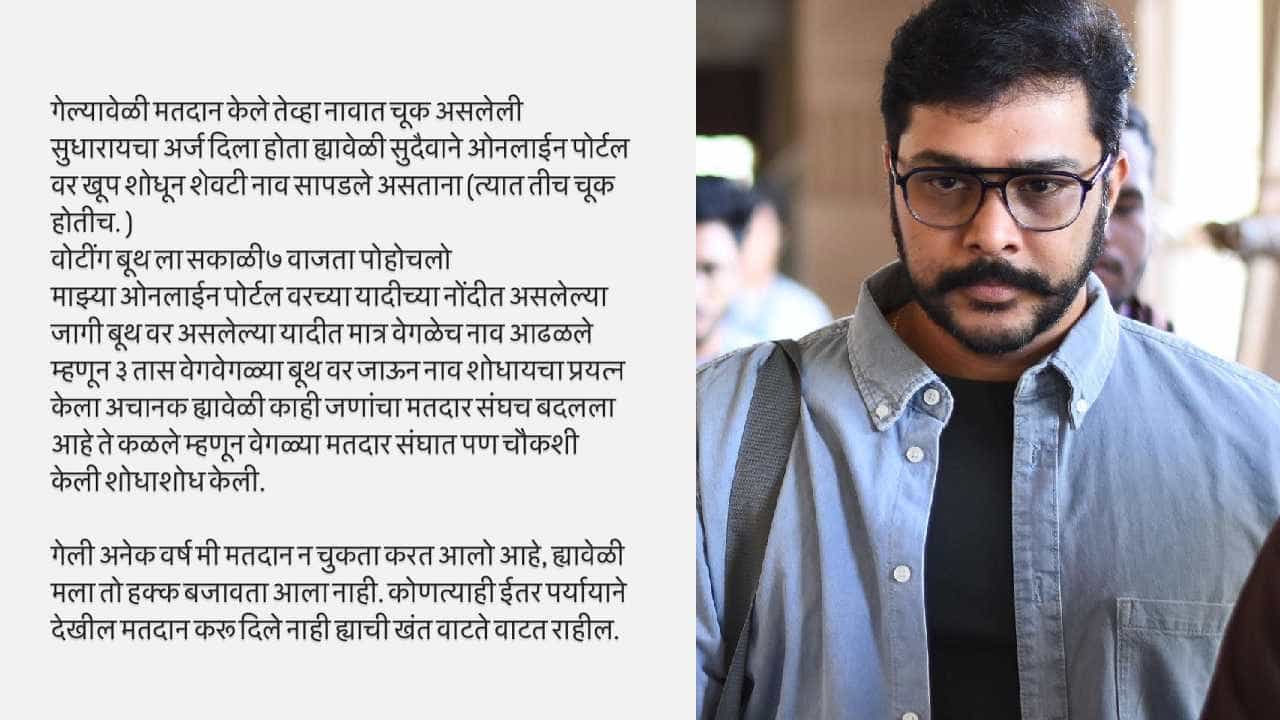 Actor Suyash Tilak on Pune Loksabha Election 2024 Voting : मतदार यादी नावाच नसल्याने अभिनेता सुयश टिळक भडकला. त्याने सोशल मीडियावर पोस्ट शेअर केलीय. यात त्याने संतप्त भावना व्यक्त केल्या आहेत. अभिनेता सुयश टिळक या पोस्टमध्ये काय म्हणाला? वाचा सविस्तर...