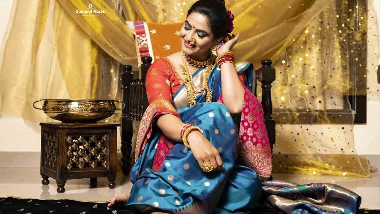 अभिनेत्री कश्मीरा कुलकर्णी ‘जर्नी प्रेमाची’, ‘कॅरी ऑन मराठा’ अशा मराठी चित्रपटांमध्ये झळकली आहे. या खास फोटोशूटमध्ये कश्मीराने निळ्या रंगाची नऊवारी साडी आणि पारंपारिक दागिने परिधान केले आहेत.