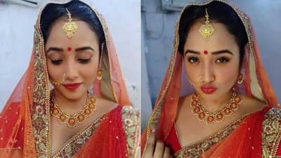 राणीनं शेअर केलेल्या फोटोंमध्ये ती वधूच्या गेटअपमध्ये दिसत आहे. फोटोमध्ये राणी लाल साडीसह पूर्ण ब्रायडल मेकअपमध्ये दिसत आहे.