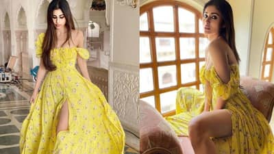 मौनी रॉयचा हा ऑफ शोल्डर आणि थाई स्प्लिट ड्रेस खूपच सुंदर दिसत आहे. आउटफिटवर फुलांचा पॅटर्न आहे आणि तिनं हे फोटो सुंदर अशा महलात क्लिक केले आहेत.