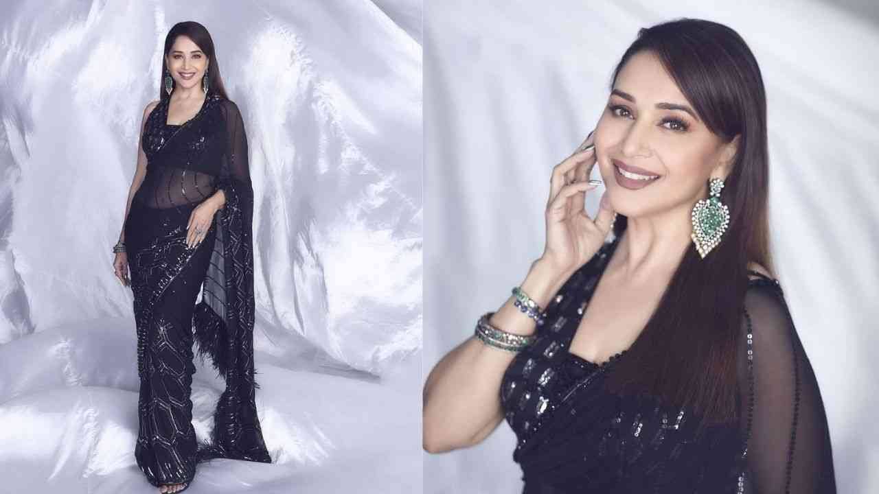 माधुरीने या फोटोशूटमध्ये ब्लॅक कलरची साडी नेसलेली दिसते आहे. या फोटोंमध्ये माधुरी प्रचंड सुंदर दिसत आहे. नेहमीप्रमाणे तिचा क्लासिक लूक चाहत्यांच्या पसंतीस उतरतो आहे.