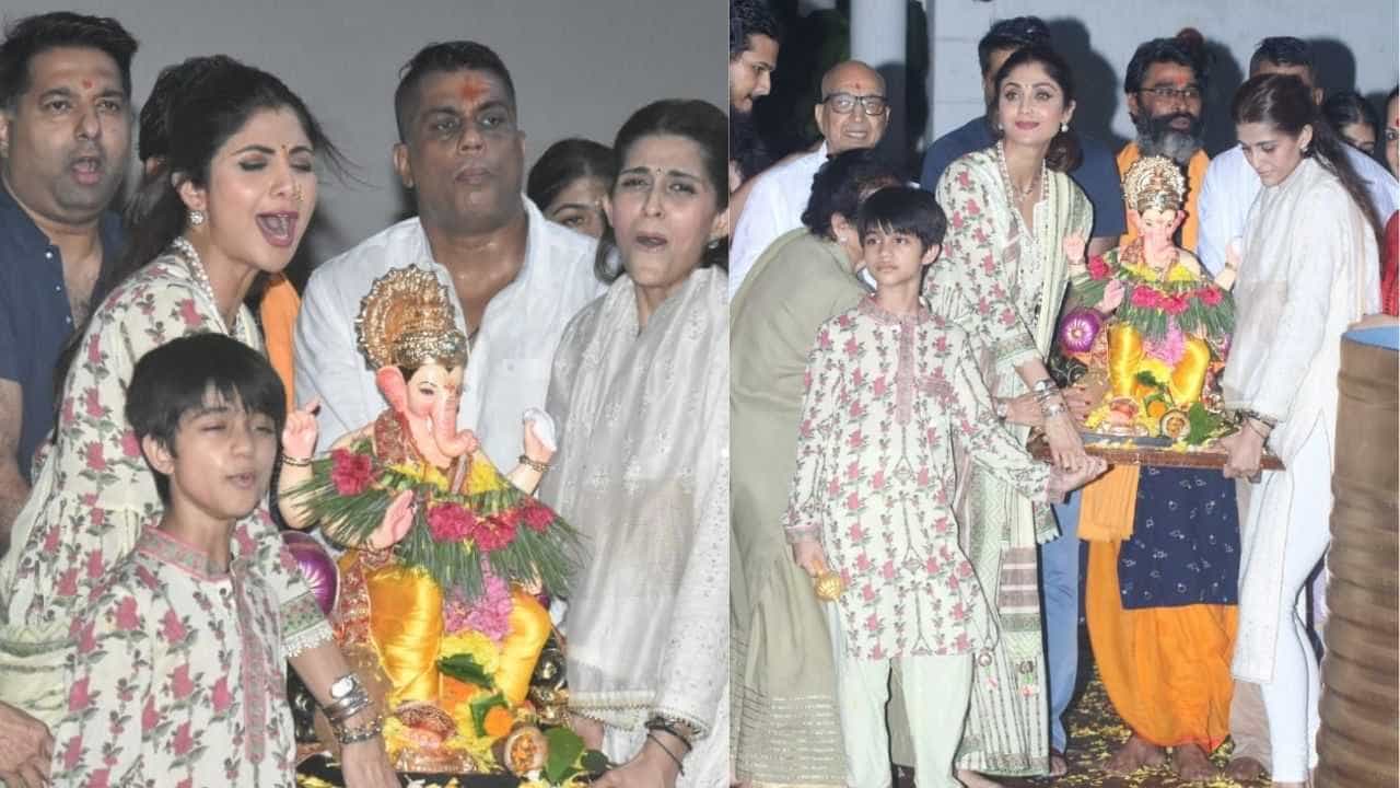 शिल्पा शेट्टी गणपती बाप्पााला घेऊन तिच्या घराबाहेर आली होती. यावेळी तिच्यासोबत तिचा मुलगा वियान सुद्धा इथं दिसला.