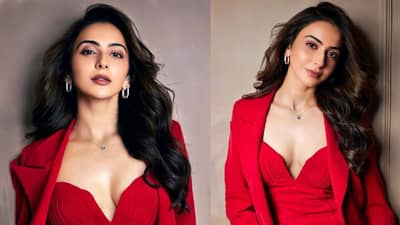 रकुल प्रीत सिंहने रेड कलरचा ड्रेस परिधान केला आहे, ज्यावर तिने लाल रंगाचा ब्लेझर घातला आहे. या डीप नेक लाइन ड्रेसमध्ये रकुल प्रीतची किलर स्टाईल पाहण्यासारखी आहे.