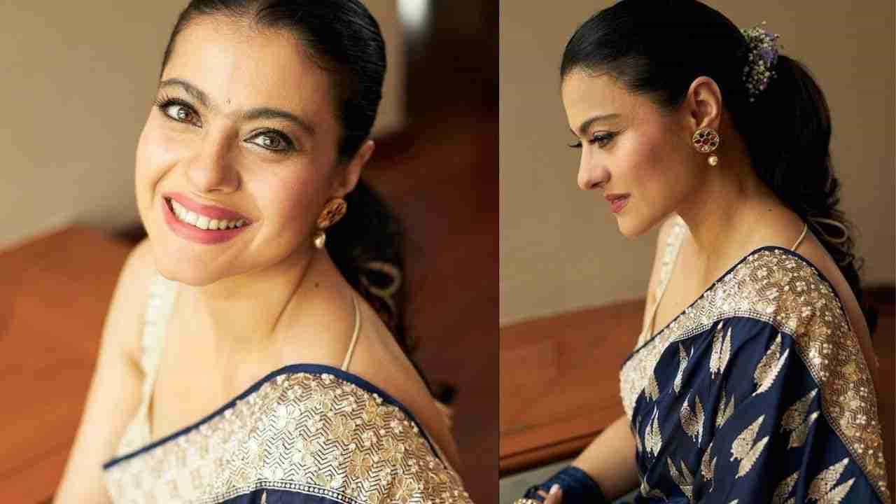 हेअरस्टाईलबद्दल बोलायचं झालं तर, या लूकसह काजोलने तिच्या केसांमध्ये पोनीटेल बनवली आहे. काजोल एका ग्लॉसी बेस, आयलाइनर आणि ब्लू साडीवर गडद किरमिजी रंगाच्या लिपस्टिकमध्ये आकर्षक दिसत होती. अभिनेत्रीने तिच्या कपाळावर एक लहान टिकली लावली, जी तिच्या साडीला पूर्ण करत आहे.