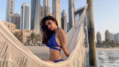 निळ्या रंगाच्या हाल्टर-नेक बिकिनीमध्ये मौनी खूप सुंदर दिसत आहे. मौनी केस मोकळे सोडून समुद्र किनाऱ्याच्या मध्यभागी एका खांबावर टांगलेल्या क्रोकेट हॅमॉकवर बसली आहे.