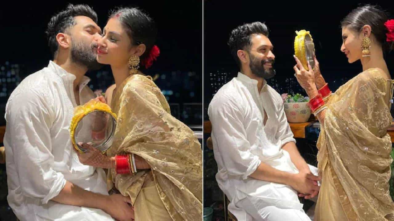 करवा चौथनिमित्त मौनी रॉयचा सुंदर लूक बघायला मिळाला. मौनीने सुंदर साडी आणि चूडा घातलेला फोटोंमध्ये दिसत आहेत. व्रत सोडल्यानंतर मौनीने पती सूरजसोबत रोमँटिक फोटो काढले.