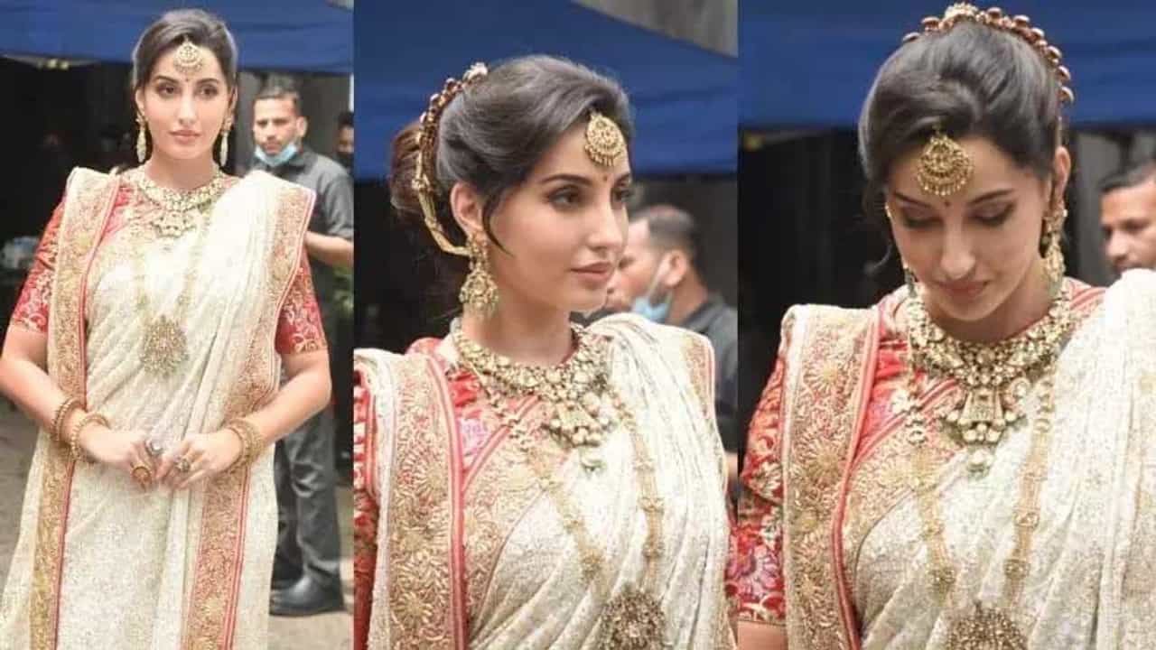 यावेळी नोराने क्रीम रंगाची साडी परिधान केली होती, ज्यामध्ये ती खूपच सुंदर दिसत होती.