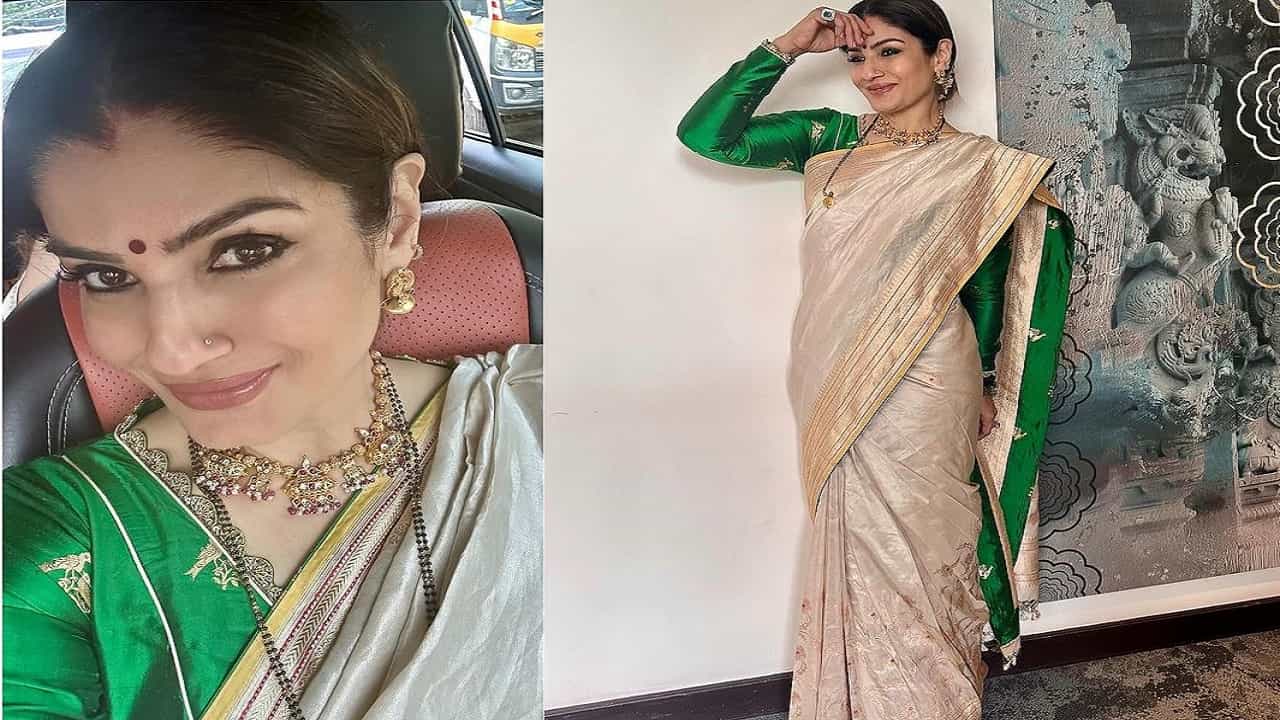 अभिनेत्री रवीना टंडन (Raveena Tandon) वयाच्या 49 व्या वर्षी देखील चाहत्यांना फॅशन गोल्स देताना दिसते. साडीमध्ये रवीना हिचं सौंदर्य कायम फुलून दिसतं. अभिनेत्री कोणत्याही महत्त्वाच्या कार्यक्रमांसाठी आणि सणांसाठी साडी नेसते.