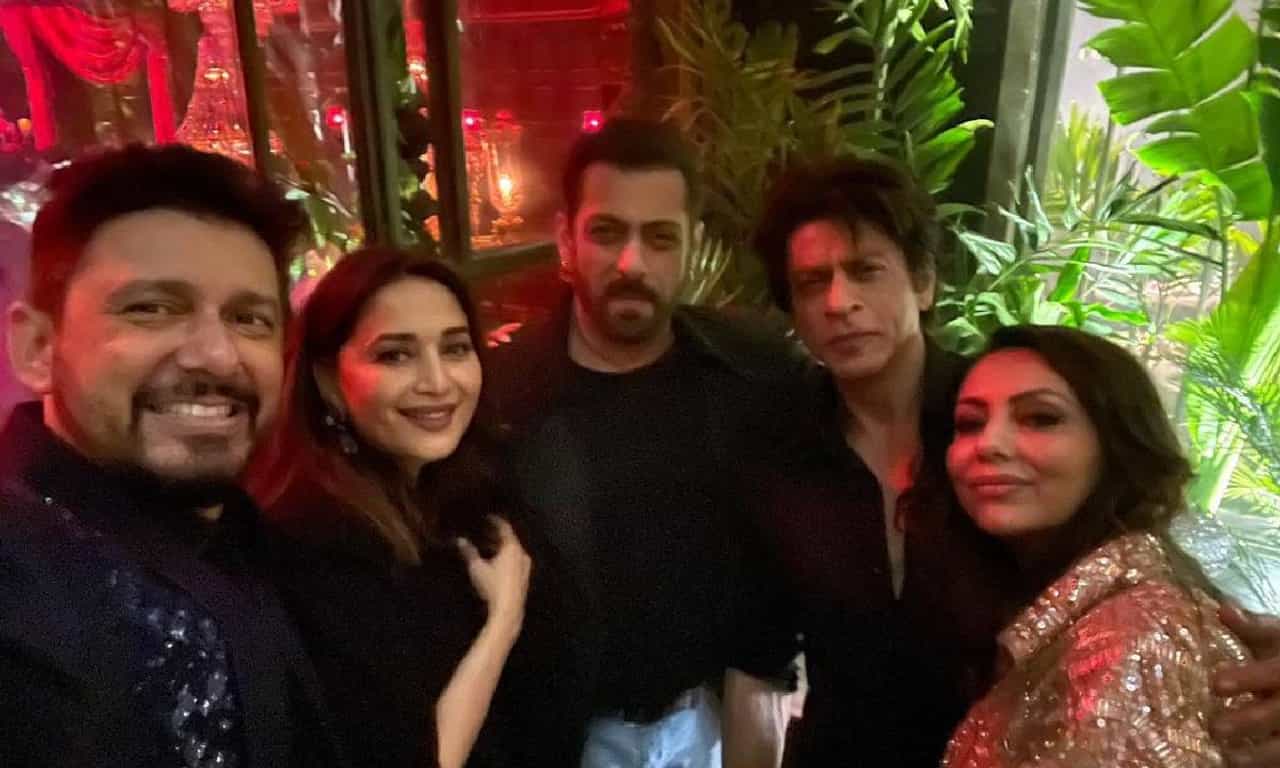 कारण जोहर 50 वर्षाचा झाला. त्यांने पार्टी ही खास त्याच्या स्टाईलमध्ये ठेवली. माधुरीने हा फोटो तिच्या इन्स्टाग्राम अकाऊंटवरून शेअर केला आहे. यात माधुरीचे पती डॉक्टर नेने, सलमान खान, शाहरूख खान आणि पत्नी गौरी दिसते आहे. 'हम तुम्हारे हैं सनम' नंतर तिघांना एकत्र बघून फॅन्सनी कमेंटस केल्या आहेत. तीघांना एकत्र बघून माधुरी सलमान आणि शाहरुखच्या फॅन्सना विशेष आनंद झाला आहे.