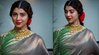 तेजस्विनीने या फोटोशूटमध्ये ग्रे रंगाची साडी परिधान केली होती. सोबतच लाल रंगाची लिपस्टिक आणि केसांत लाल गुलाबांची फुलं, गळ्यात भरजरी हार, असा हा तिचा लूक सर्वांचे लक्ष वेधून घेत आहे.