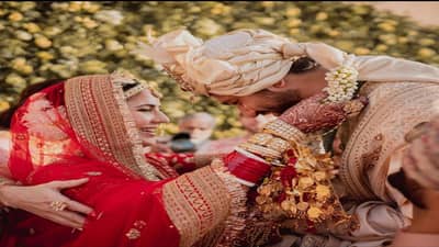 वधू-वरांच्या जोडीमध्ये विकी कौशल आणि कतरिना कैफ खूपच सुंदर दिसत आहेत. विक्कीने लग्नात ऑफ व्हाइट शेरवानी घातली आहे. दुसरीकडे, कतरिना कैफ लाल रंगाच्या लेहेंग्यात खूपच सुंदर दिसत आहे.