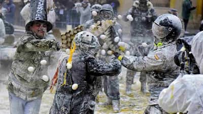 स्पेनमधल्या इबी शहरात 1856पासून दरवर्षी 28 डिसेंबर रोजी हा सण साजरा केला जातो. यात विरोधी पक्षाचे सदस्य पीठ आणि अंडी एकमेकांवर फेकतात. तुम्ही अशा युद्धाबद्दल ऐकलं असेल ज्यामध्ये दारूगोळा किंवा शस्त्रं वापरली जात नाहीत. तुम्हाला आश्चर्य वाटेल, की याच्याशिवाय युद्ध काय असेल? पण आज आपण ज्या युद्धाबद्दल बोलत आहोत, त्यात अंडी फेकली जातात. लोक त्यांच्या प्रतिस्पर्ध्यावर पिठानं हल्ला करतात. खरंतर आम्ही स्पेनमध्ये साजऱ्या होणाऱ्या एल्स एनफॅरिनट्स उत्सवाविषयी बोलत आहोत. (फोटो : GCTN)