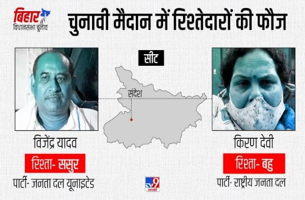 - पती-पत्नीशिवाय या निवडणुकीत सासरे आणि सुनेमध्ये देखील लढत होत आहे. संदेश विधानसभा मतदारसंघातून जेडीयूच्या तिकिटावर बिजेंद्र यादव आणि राष्ट्रीय जनता दलाच्या तिकिटावर किरण देवी निवडणूक लढत आहेत. दोघांमध्ये सासरे आणि सून असं नात आहे.