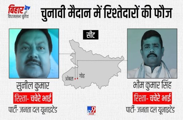 - जनता दल युनायटेडने सुनील कुमार यांना ओबरा मतदारसंघाचं तिकिट दिलंय, तर त्यांचे भाऊ भीम कुमार सिंह यांना गोह मतदारसंघातून उमेदवारी मिळाली आहे.