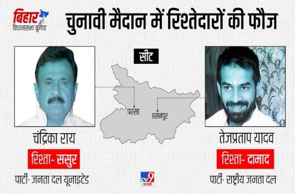 - आधी राजदमध्ये असलेले दिग्गज नेते चंद्रिका राय यावेळी जनता दल युनायटेडमधून निवडणूक मैदानात आहेत. दुसरीकडे त्यांचे जावई तेज प्रताप यादव हसनपूर मतदारसंघातून उभे आहेत.