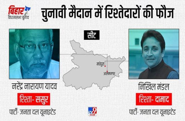 - जेडीयूचे वरिष्ठ नेते नरेंद्र नारायण यादव मधेपुरा मतदारसंघातून, तर त्यांचे जावई निखिल मंडल जेडीयूच्याच तिकिटावर आलमनगर मतदारसंघातून उभे आहेत.