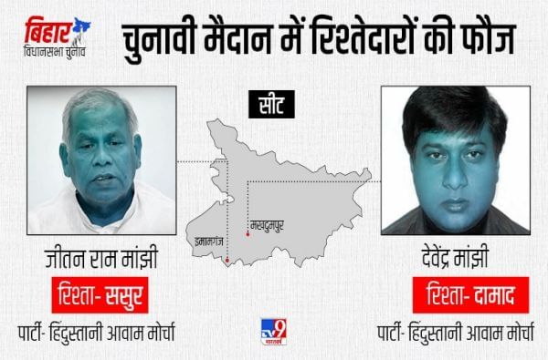 - जीतन राम मांझी यांचे जावई देवेंद्र मांझी देखील हिंदुस्तानी आवाम मोर्चाच्या तिकिटावर मखदुमपूर मतदारसंघातून निवडणूक लढत आहेत.