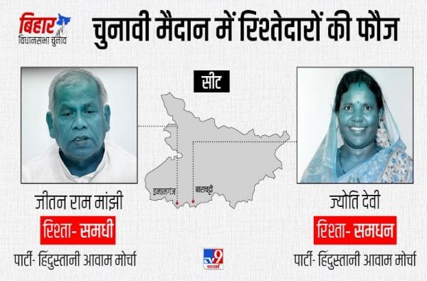- माजी मुख्यमंत्री जीतन राम मांझी यांच्या हिंदुस्तानी आवाम मोर्चा (हम) या पक्षातून त्यांचे अनेक नातेवाईक निवडणूक रिंगणात आहेत. जीतन राम स्वतः इमामगंज मतदारसंघातून उभे आहेत. दुसरीकडे त्यांची नातेवाईक ज्योती देवी बाराचट्टी मतदारसंघातून उभ्या आहेत.