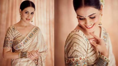सोशल मीडियावर समोर आलेल्या फोटोंमध्ये अभिनेत्री जेनेलिया क्रीम रंगाच्या बॉर्डरच्या साडीत दिसत आहे. ब्लाउजवर तिचे जरीचे काम केले आहे. साडीसोबतच तिने सुंदर मेकअप केलाय तर केसांत आंबाडा घालत गजरा लावला आहे.