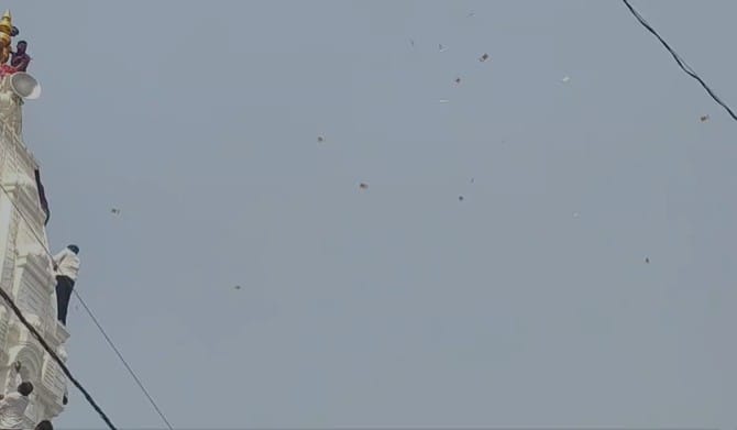 हनुमानाच्या मंदिराच्या कळसावरुन नोटांची बरसात, नोटांना पकडण्यासाठी भाविकांची झुंबड