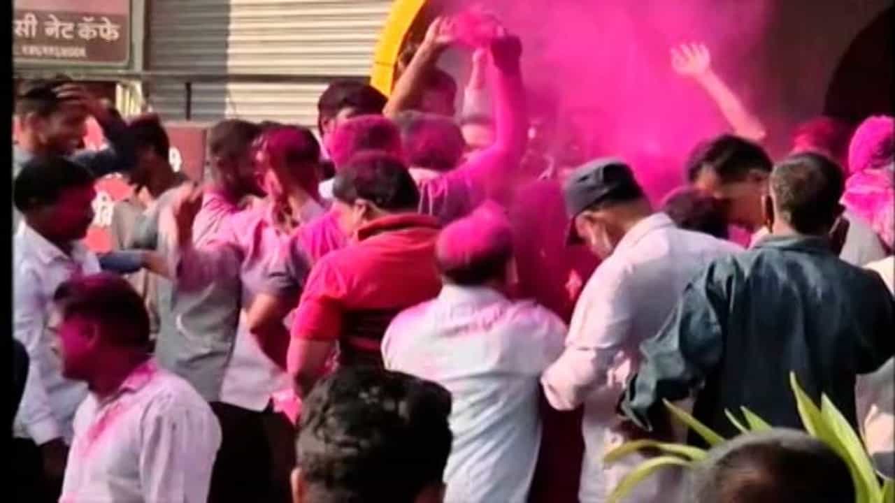 आनंदात कार्यकर्ते गुलाल उधळत जल्लोष साजरा करत आहेत.