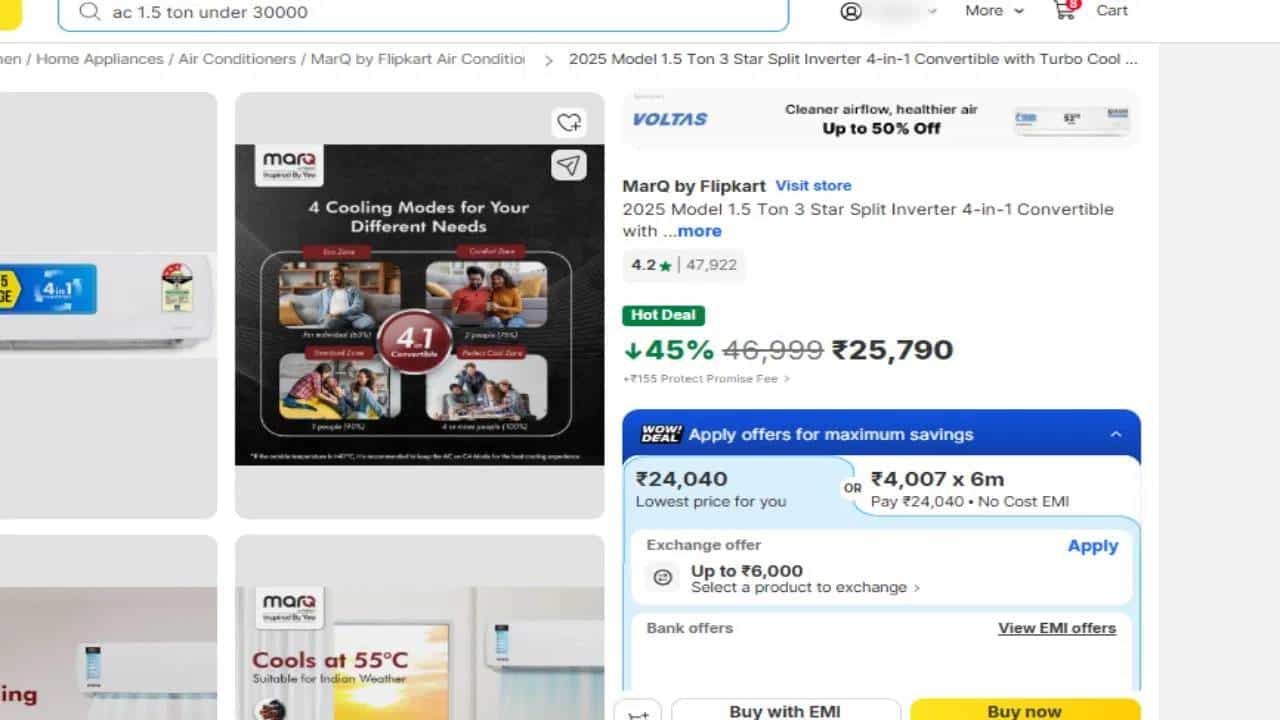 Marq 1.5 Ton 3 Star AC : हा एसी 45 टक्के सवलतीसह 25 हजार 790 रुपयात विकला जातोय. या प्रोडक्टसोबत एक वर्षाची वॉरंटी आणि 10 वर्षांची कॉम्प्रेसर वॉरंटी मिळते. हे मॉडेल तुम्ही फ्लिपकार्टवरुन विकत घेऊ शकता. (फोटो- फ्लिपकार्ट)