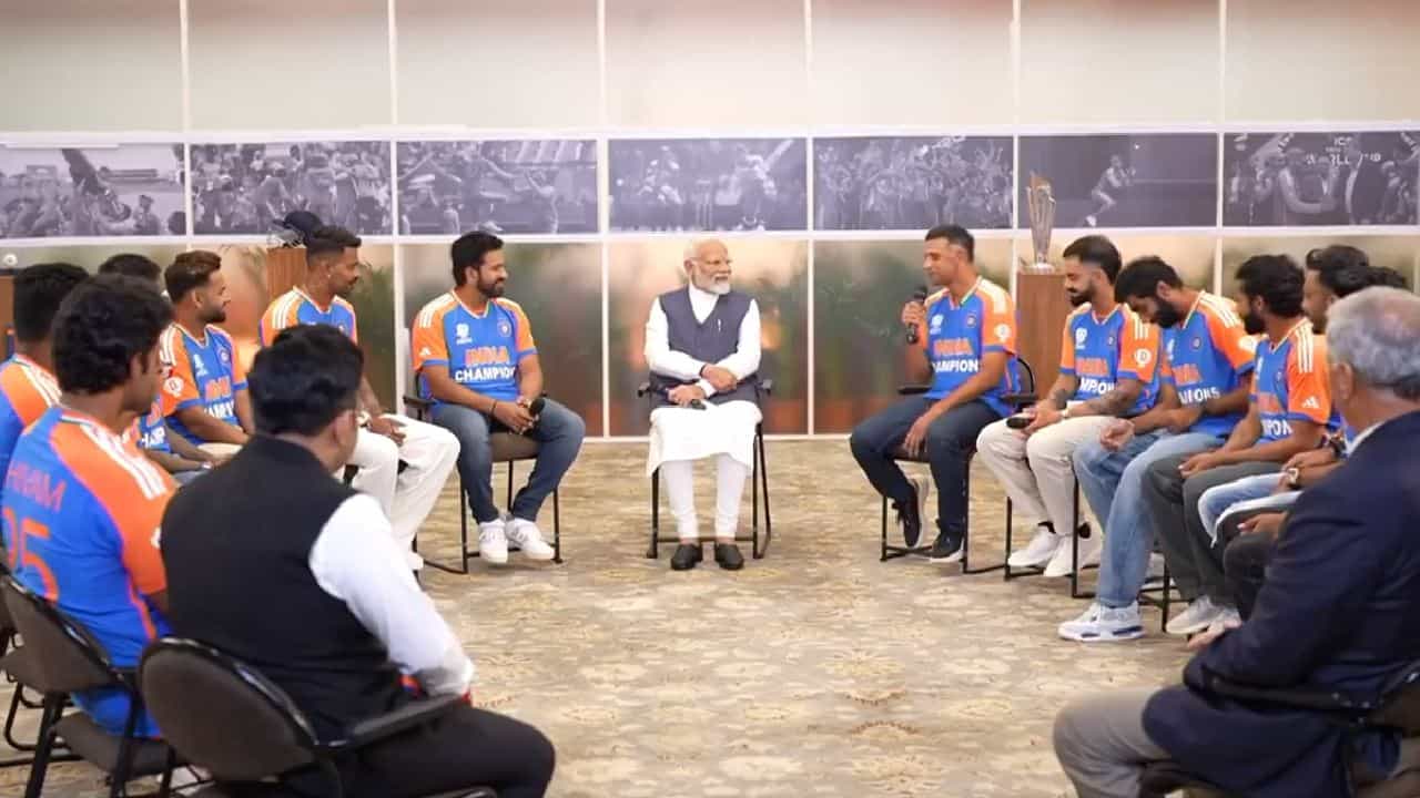 पंतप्रधान नरेंद्र मोदी यांच्यासोबत टीम इंडियाच्या भेटीचे आतील फोटो समोर आले आहेत. 7, लोक कल्याण मार्ग इथल्या पंतप्रधानांच्या निवासस्थानी ही भेट आयोजित करण्यात आली. यावेळी संपूर्ण टीम जर्सीमध्ये तिथे पोहोचली.