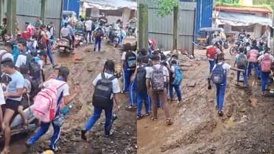 सध्या सर्वत्र मुसळधार पाऊस कोसळत आहे. या पावसामुळे अनेक रस्त्यांवर खड्डे पडले असून काही रस्त्यांची अक्षरश: चाळण झाली आहे. कल्याणमधी अनेक चिखलमय रस्त्यांमुळे विद्यार्थ्यांचे हाल सुरु आहे. त्यामुळे शाळेपर्यंत पोहोचणे कठीण जात आहे.