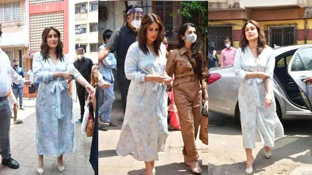 आपल्या कामाची कमीटमेंट पूर्ण करण्यासाठी तिला सेटवरहजार झाली होती. यावेळी करीनाने निळ्या रंगाचा फुलांचा ड्रेस परिधान केला होता. तिने डार्क ब्राउन लिप कलरसह मॅट फिनिश मेकअप केला होता. करीनाने नव्या हील्सच्या जोडीने आपला हा लूक पूर्ण केला आणि यावेळी तिच्या केसांचा रंग अत्यंत सुंदर दिसत होता.