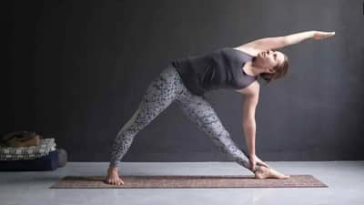 त्रिकोनासन करण्यासाठी तुमचे पाय दूर दूर करा. एक हात जमिनीवर आणि दुसरा हात वर करा. समतोल राखण्यासाठी डोळे उघडे ठेवा. हे आसन केल्याने रक्ताभिसरण सुधारते, रक्तदाब कमी होते. विशेष म्हणजे यामुळे बर्न होण्यास मदत होते.