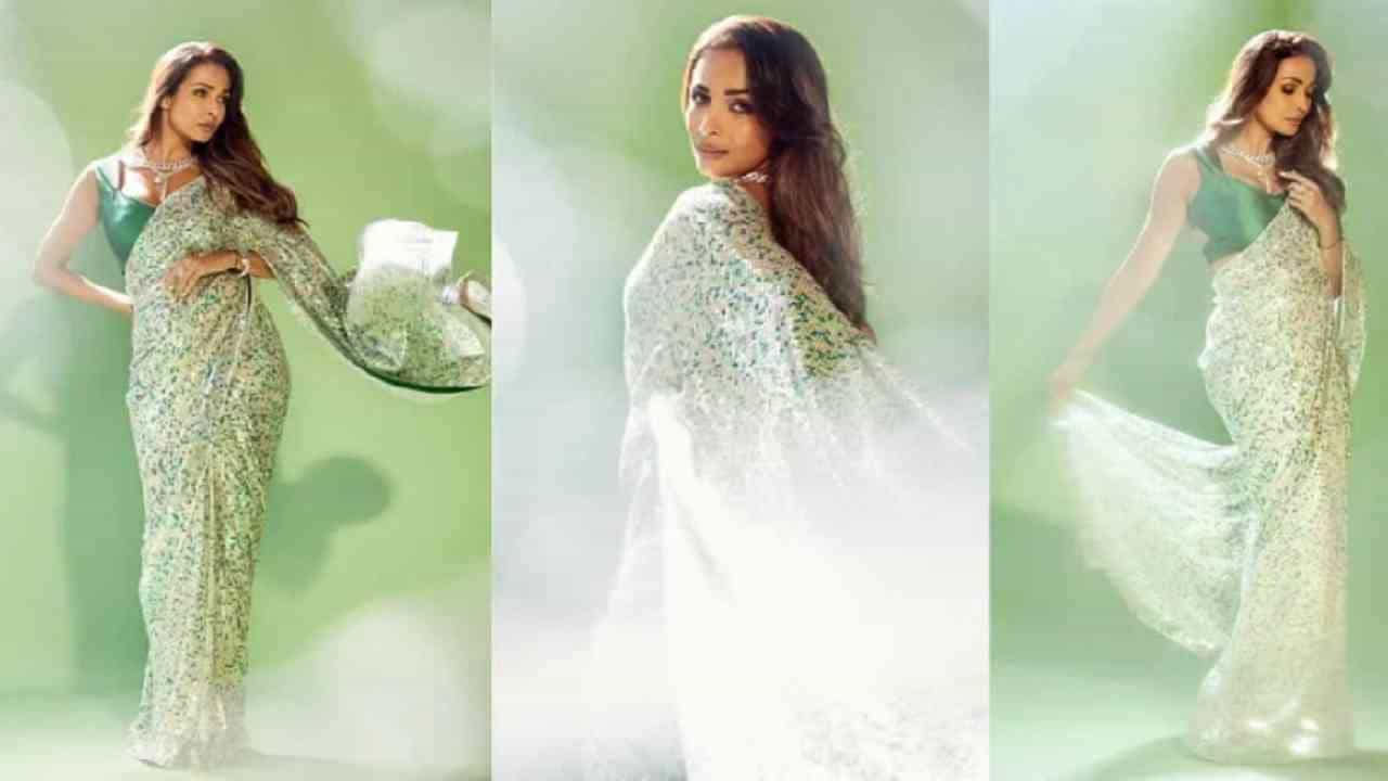 मलायकाची ही मल्टी सेक्विन फॉरेस्ट ग्रीन साडी तुम्ही देखील कॅरी करू शकता. या साडीमध्ये अनेक रंग, स्टेटमेंट प्रिंट्स आहेत.