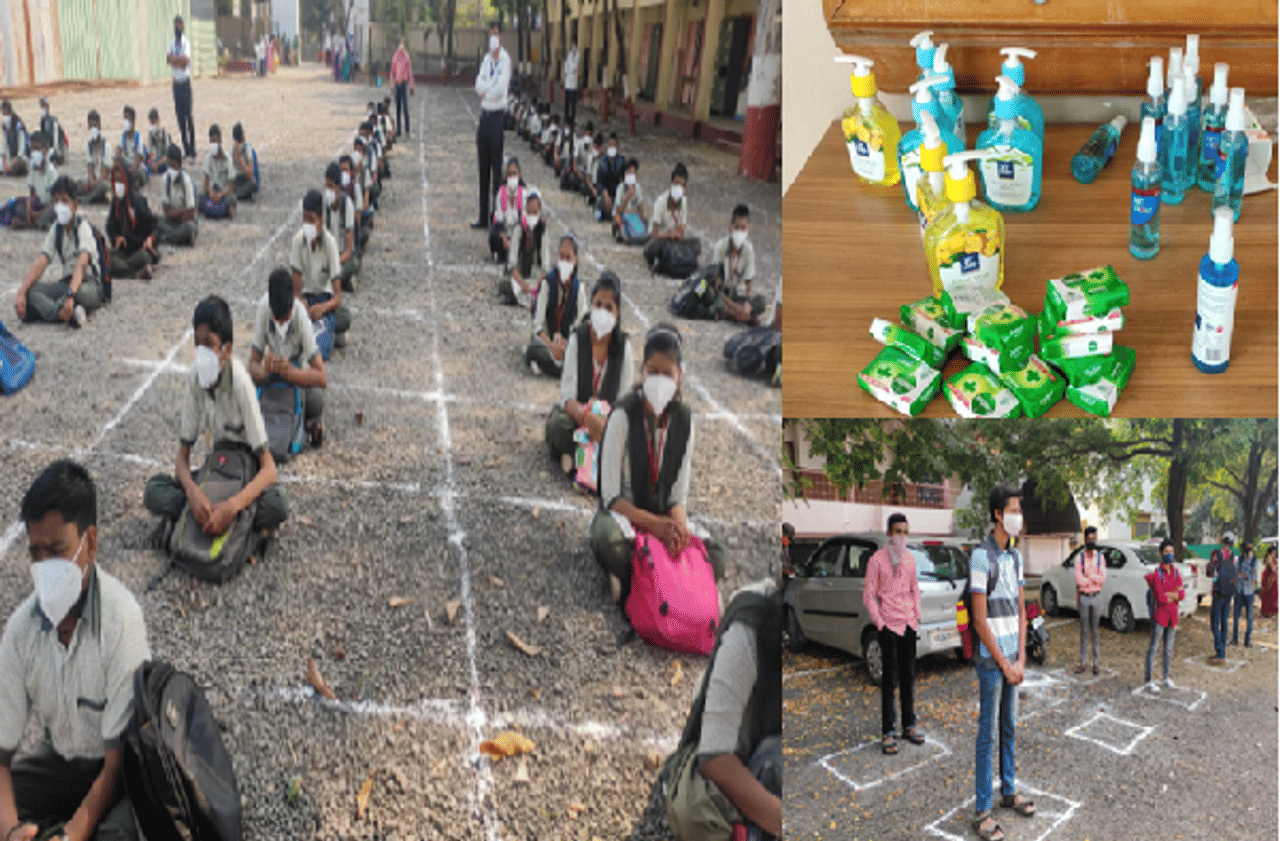 - विद्यार्थ्यांच्या स्वसंरक्षणासाठी सोशल डिस्टन्सिंग, टेंपरेचर चेकिंग, मास्क, सॅनिटाईझरची व्यवस्था करण्यात आलीये.