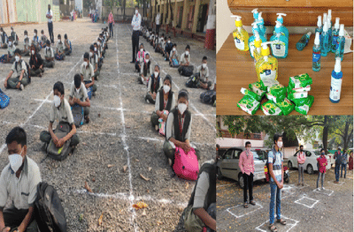 विद्यार्थ्यांच्या स्वसंरक्षणासाठी सोशल डिस्टन्सिंग, टेंपरेचर चेकिंग, मास्क, सॅनिटाईझरची व्यवस्था करण्यात आलीये.