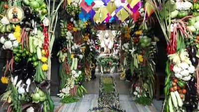 मकर संक्रांतीच्या निमित्ताने आज श्री विठ्ठल रुक्मिणी मंदिरात विविध 60 प्रकारच्या भाजीपाल्यांची आरास केली आहे त्यामुळे देवाचा गाभारा हिरव्या भाजी पाल्याने बहरला आहे. मंदिरात विविध फळ भाज्यांची शेती बहरल्याचा भाविकांना अनुभव येत आहे.