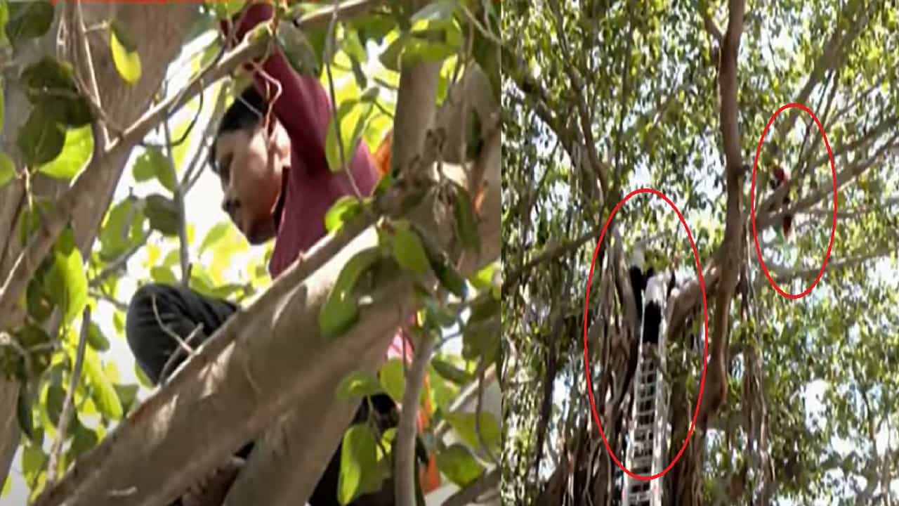 दोन अग्निशमन दलाचे जवान शिडीच्या सहाय्याने झाडावर चढले आहेत. जवान व्यक्तीला खाली उतरवण्याचा प्रयत्न करत आहेत. व्यक्तीला समजवण्याचा प्रयत्न पोलिसांकडून देखील सुरू आहे. पण व्यक्ती झाडावर आणखी वर जाऊन बसली आहे.