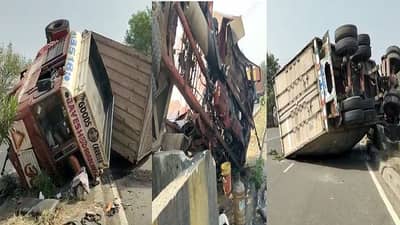 नाशिककडून मुंबईच्या दिशेने भरधाव वेगाने एक कंटेनर जात होता. त्यावेळी चालकाचा ताबा सुटून कंटेनर साधारण 200 फूट अंतरावरुन घसरत आला आणि दोन्ही लेनच्या मधोमध जाऊन ब्रीजच्या वर धडकून पलटला. त्यामुळे कंटेनरचे पुढील दोन्ही व्हील तुटून ब्रीजच्या मधोमध असलेल्या गॅपमधून खाली पडले.