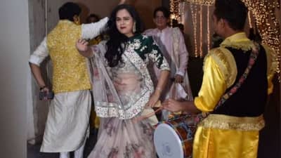 पद्मिनी यांनी देखील मुलाच्या लग्नात खूप धमाल केली. एवढंच नाही तर त्यांनी ढोल ताशांवर तालही धरला.