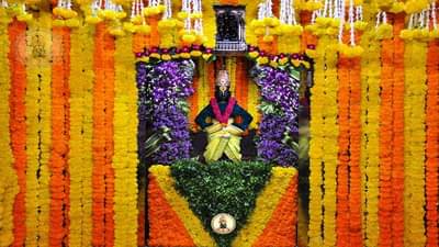 विविध रंगाच्या फुलांनी देवाचा गाभारा उजळून निघाला आहे.