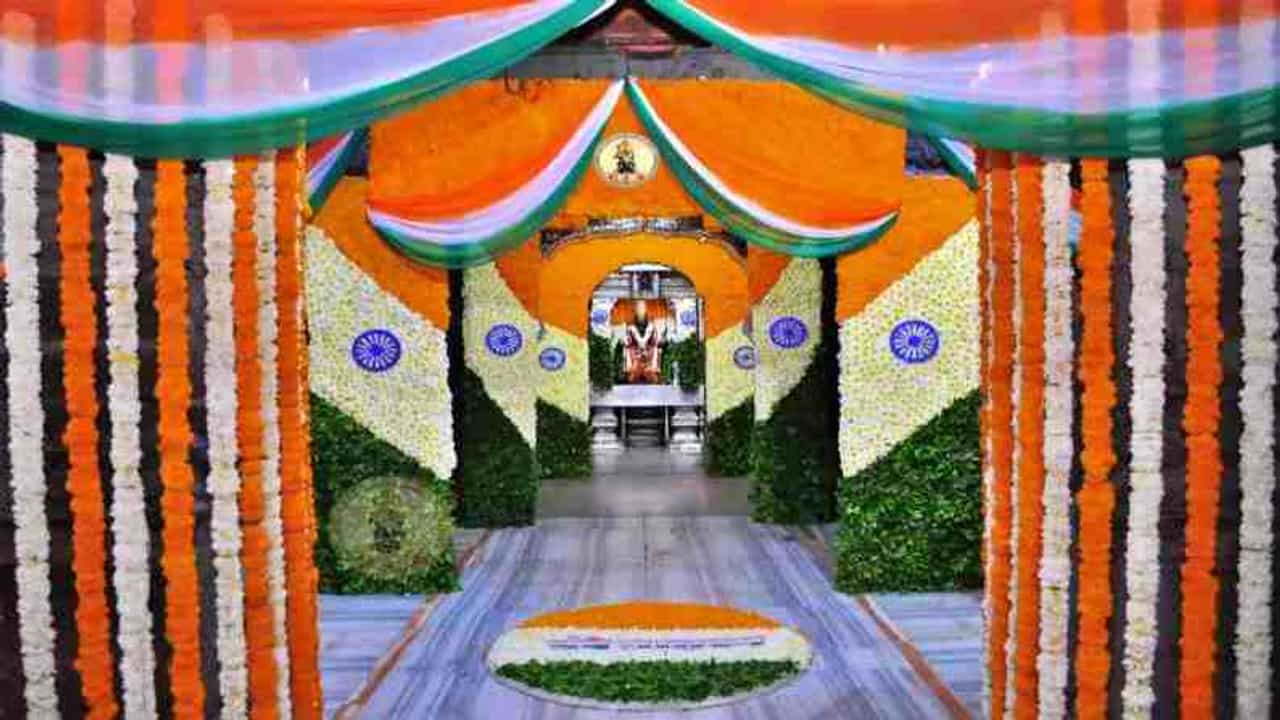 मंदिरातील दर्शनी भागातील खांबांवर केशरी, सफेद फुलांनी आणि हिरव्या पानांनी आखीवरेखीव सजावट करुन तिरंग्याची प्रतिमा तयार करण्यात आलीय.