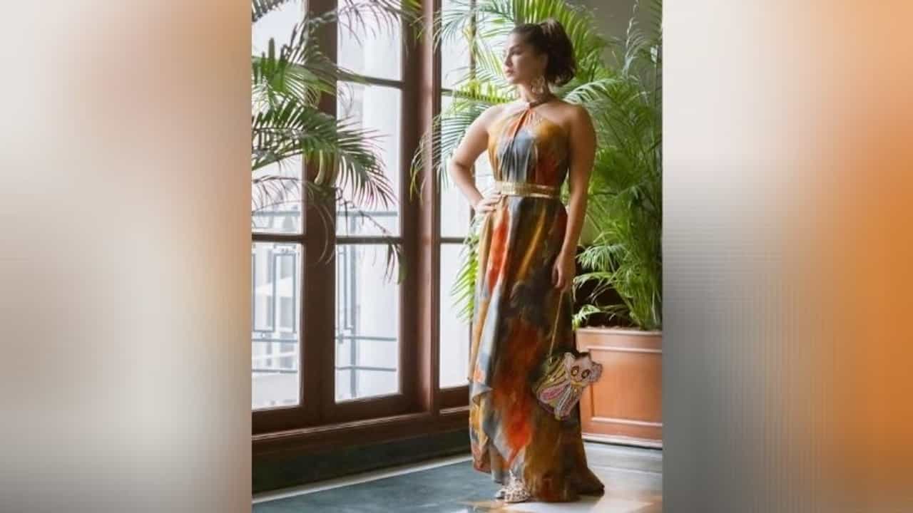 - सनीच्या या प्रिंटेड रेयॉन गाऊनवर पिवळे, केसरी आणि निळ्या रंगाच्या मल्टीकलर्ड शेड्स दिसत आहेत. याशिवाय या ड्रेसला हॉल्टर नेक देण्यात आलीय. त्यामुळे हा ड्रेस अधिकच उठून दिसतोय.
