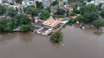 पुणे शहरात गुरुवारी झालेल्या पावसामुळे मुठा नदीपात्र पाण्याने तुडुंब भरले. पावसामुळे लाखो भक्तांचे श्रद्धास्थान असलेल्या मोरया गोसावी मंदिराला पाण्याने पूर्णपणे वेढा घातला होता.