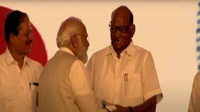 पंतप्रधान नरेंद्र मोदी यांनी शरद पवार यांची मंचावर भेट घेतली. त्यांच्याशी हस्तांदोलन केलं. यावेळी दोन्ही नेत्यांच्या चेहऱ्यावर हास्य होतं.
