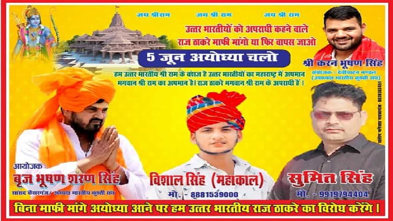 उत्तर प्रदेशचे भाजप खासदार ब्रिजभूषण शरण सिंह यांनी राज ठाकरे यांच्या ५ जूनच्या अयोध्या दौऱ्याला विरोध करताना, त्यांनी आधी उत्तर भारतीय लोकांची माफी मागावी, असा इशारा दिला आहे. राज ठाकरे यांनी अनेकवेळा उत्तर भारतीयांचा अपमान केला आहे. अशा परिस्थितीत त्यांना उत्तर प्रदेशात येऊ देऊ नये असंही ते म्हणाले आहेत.