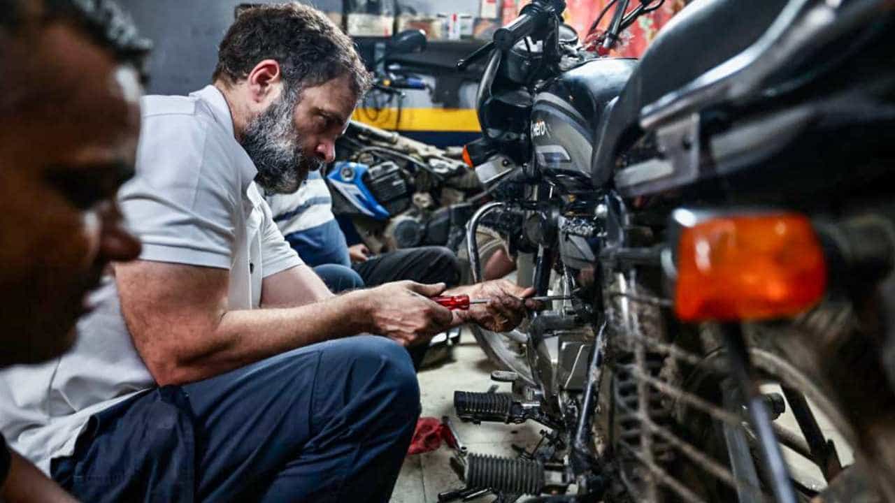 हातात पाना घेत राहुल गांधी यांच्याकडून टू व्हीलरचं रिपेअरिंग; फोटोंचा सोशल मीडियावर धुमाकूळ