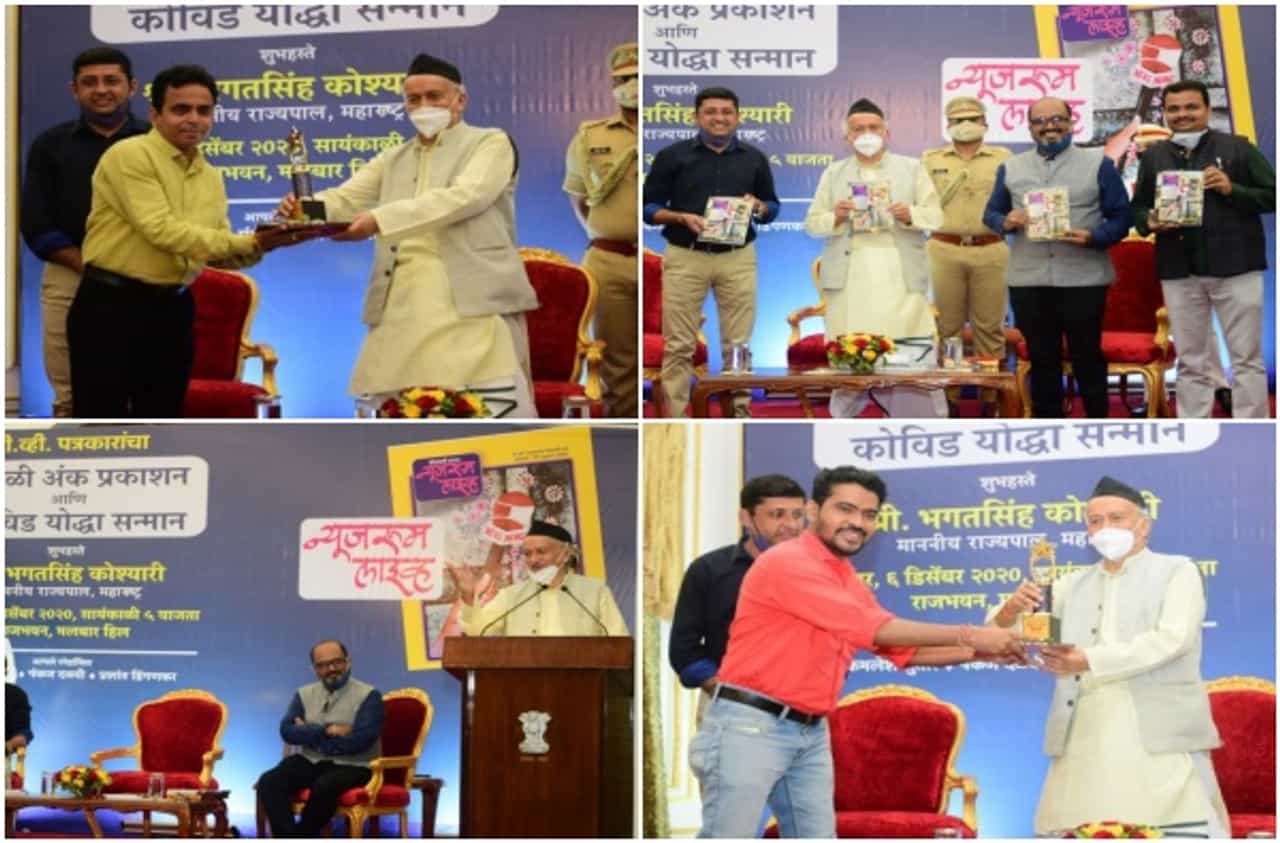 महाराष्ट्राचे राज्यपाल भगतसिंह कोश्यारी यांच्या हस्ते मुंबईत कोरोना वॉरियर ठरलेल्या पत्रकारांचा सन्मान करण्यात आला. यामध्ये टीव्ही 9 मराठीच्या दोन पत्रकारांचा गौरव करण्यात आला.