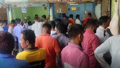 2 ते 3 तासापासून रांगेत उभा राहून नागरिक मटण घेत आहेत.विरार पूर्व स्टेशन परिसरातील जय भवानी मटणाच्या दुकानां समोरची दुपारी 1 च्या सुमारास ची ही दृश्य आहेत.