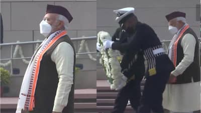पंतप्रधान नरेंद्र मोदी यांनी आज सकाळी नॅशनल वॉर मेरोरियर येथे गेले, तेव्हा केंद्रीय संरक्षण मंत्री राजनाथ सिंह आणि तिन्ही संरक्षण दलांच्या प्रमुखांनी त्यांचे स्वागत केले. पंतप्रधानांनी विविध युद्ध आणि ऑपरेशनमध्ये शहीद झालेल्या सुमारे 26,000 जवानांना श्रद्धांजली वाहिली. त्यांच्या कार्याला अभिवादन केलं. यानंतर पंतप्रधान मोदींनी व्हिजिटर बुकवर सही केली. त्यानंतर ते राजपथकडे रवाना झाले.
