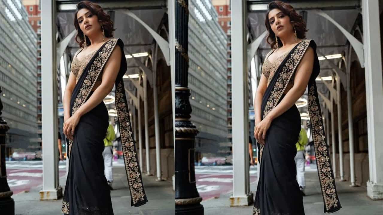 काळ्या रंगाची साडी आणि तिला सोनेरी रंगाची काठ. बाह्या नसलेला ब्लाऊज आणि बोल्ड मेकअप. यात तिने गुलाबी, केशरी रंगाचे दागिने परिधान केलेत. हा ब्लाऊज इतका फॅशनेबल आहे की त्यामुळेच या साडीला जास्त चांगला लूक आलाय.